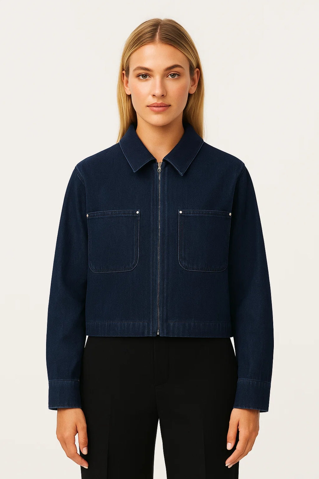 Dit cropped damesjasje met ritssluiting en opgestikte borstzakken heeft een cleane en tijdloze uitstraling. Ideaal voor een casual of licht zakelijke look.