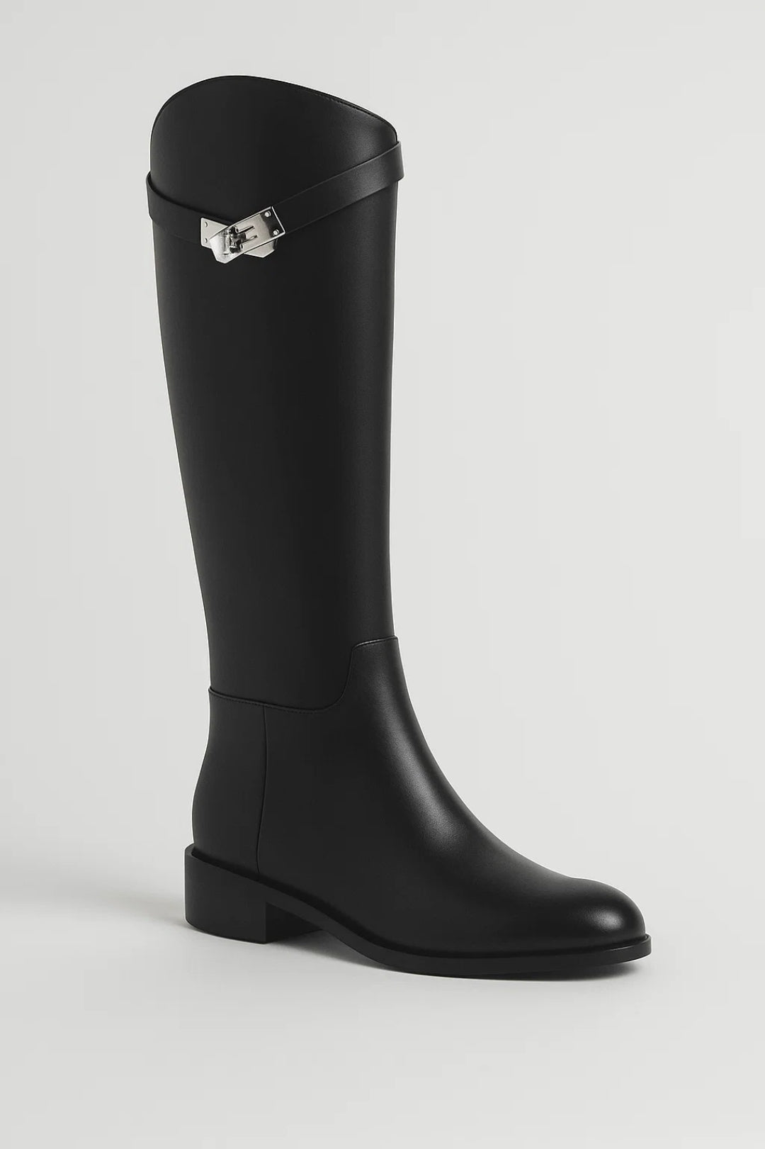 Minimalistische dames laarzen met strakke schacht en subtiel gespdetail.