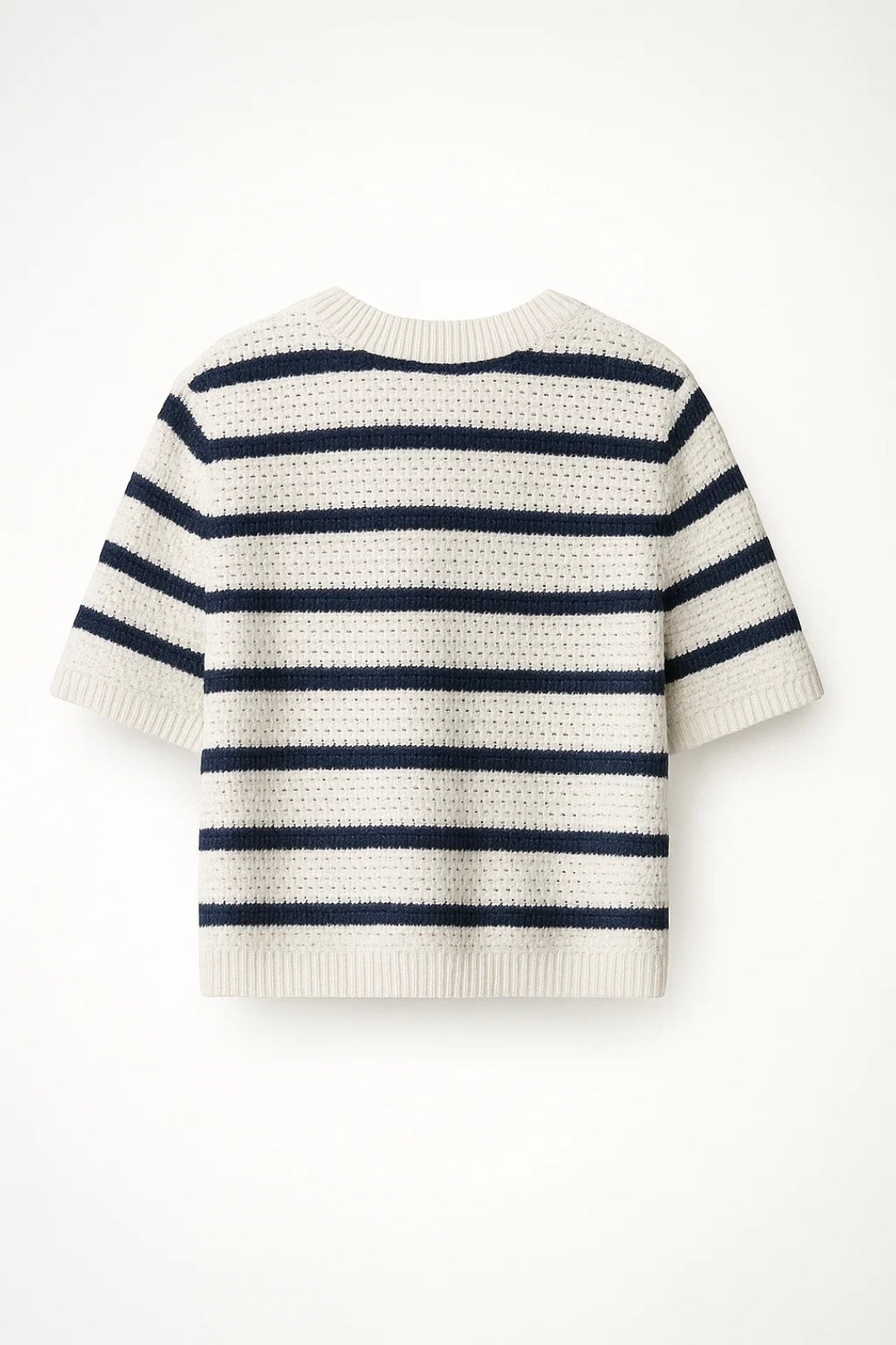 Dit dames vest met korte mouwen en subtiel gestreept ontwerp combineert een stijlvolle uitstraling met comfortabel draaggemak. De ronde hals en klassieke knopenrij maken dit item ideaal voor gelaagde outfits tijdens frisse herfstdagen of binnenshuis in het tussenseizoen.