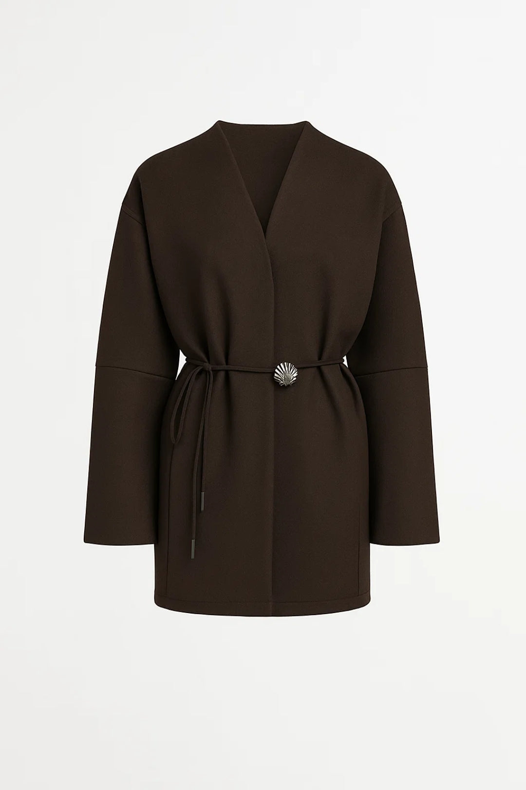 Deze korte damesjas heeft een minimalistische snit en wordt in de taille gesloten met een fijn koord en decoratief accent. De rechte lijnen en diepe V-hals zorgen voor een moderne, vrouwelijke uitstraling.