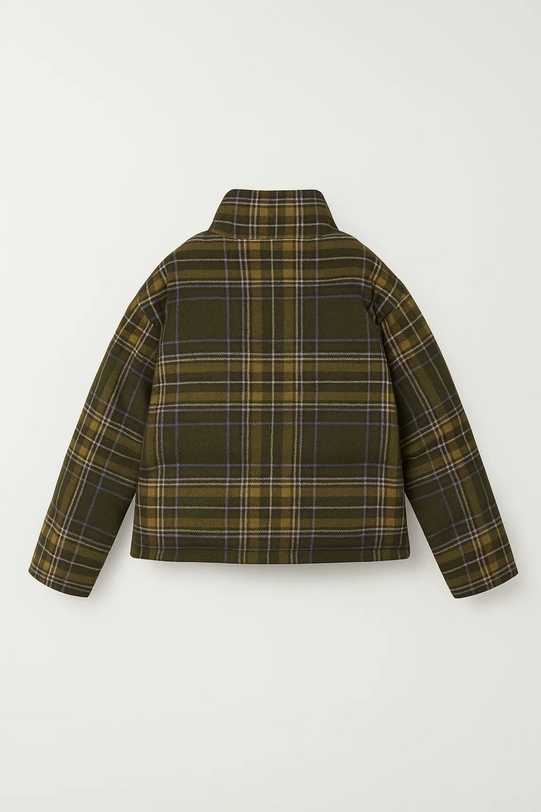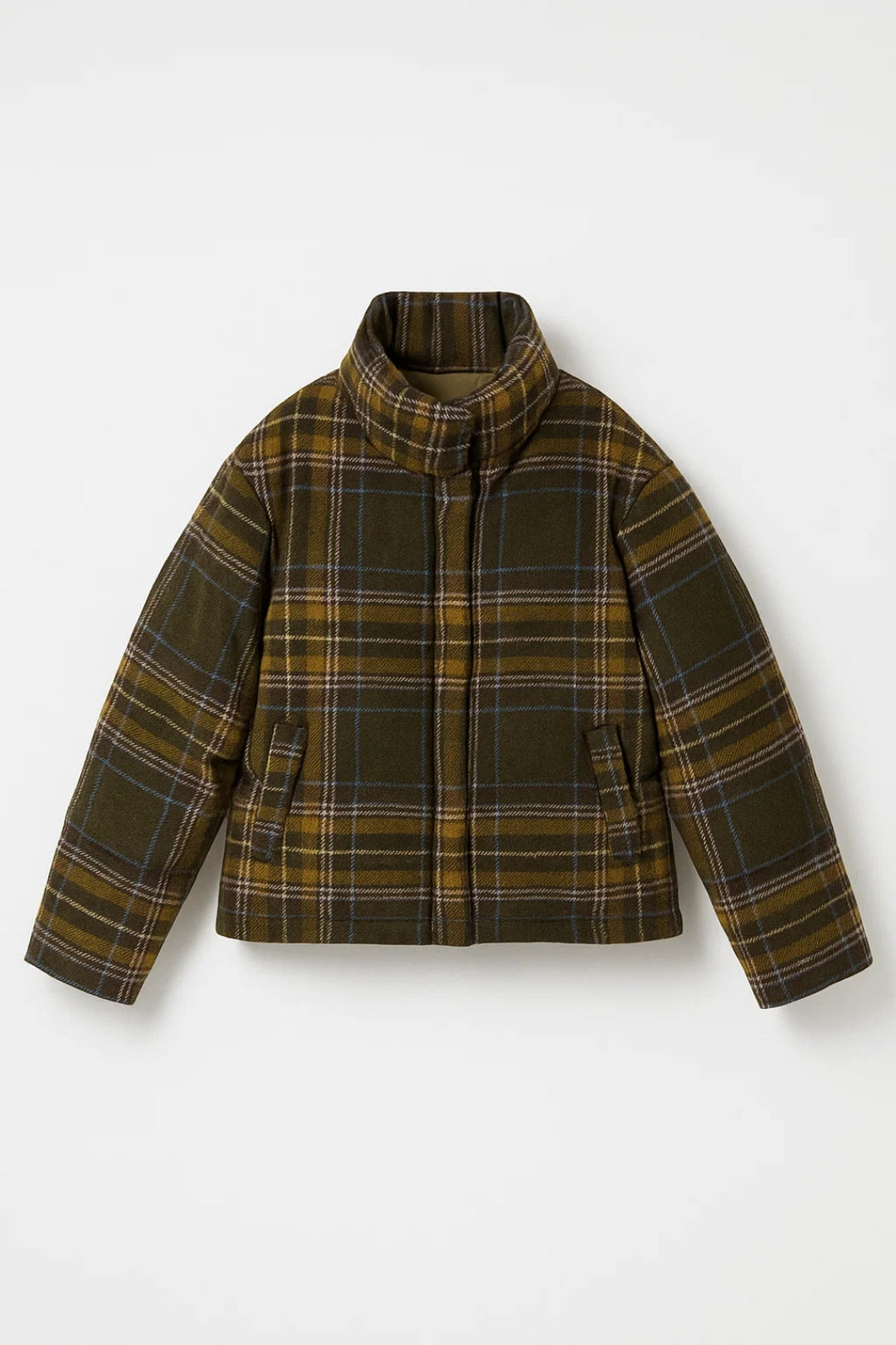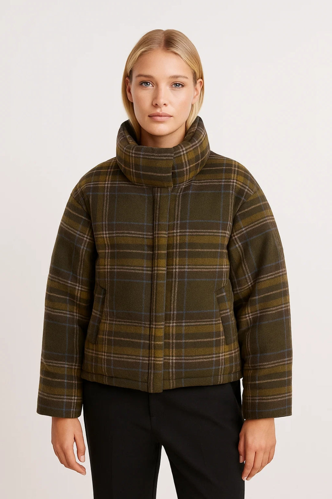 Deze korte jas met tijdloos ruitpatroon en hoge opstaande kraag biedt zowel comfort als karakter. De moderne pasvorm maakt hem perfect voor frisse dagen zonder in te leveren op stijl.