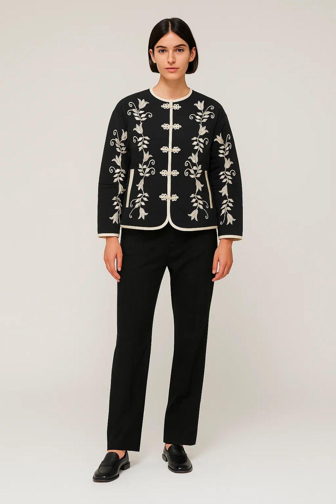 Dit korte damesjack valt op door zijn sierlijke borduursels en decoratieve sluiting. Het elegante silhouet en het contrasterende borduurwerk geven elke outfit karakter.