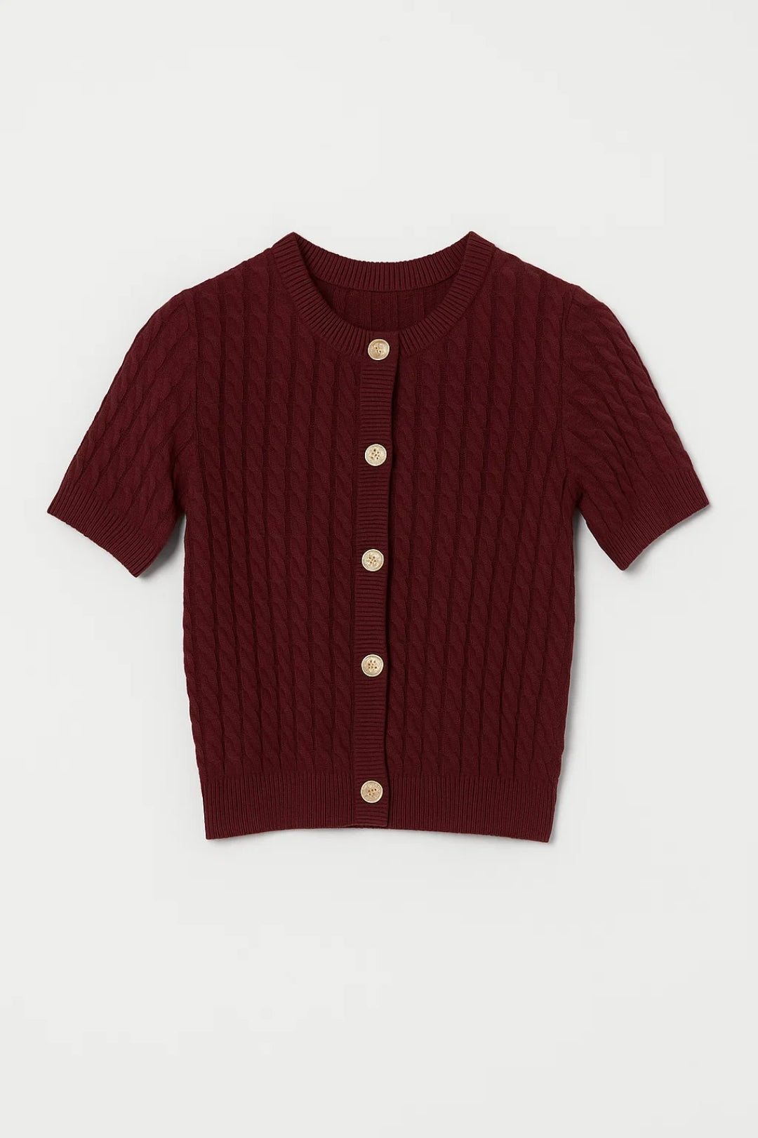 Dit dames vest met korte mouwen en verfijnde kabelstructuur biedt een tijdloze en verzorgde uitstraling. De goudkleurige knopen geven het ontwerp een subtiel chique detail, terwijl de korte pasvorm het model modern en veelzijdig maakt voor het tussenseizoen of binnenshuis.