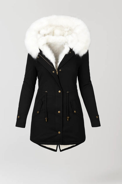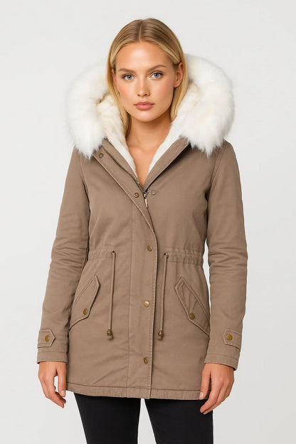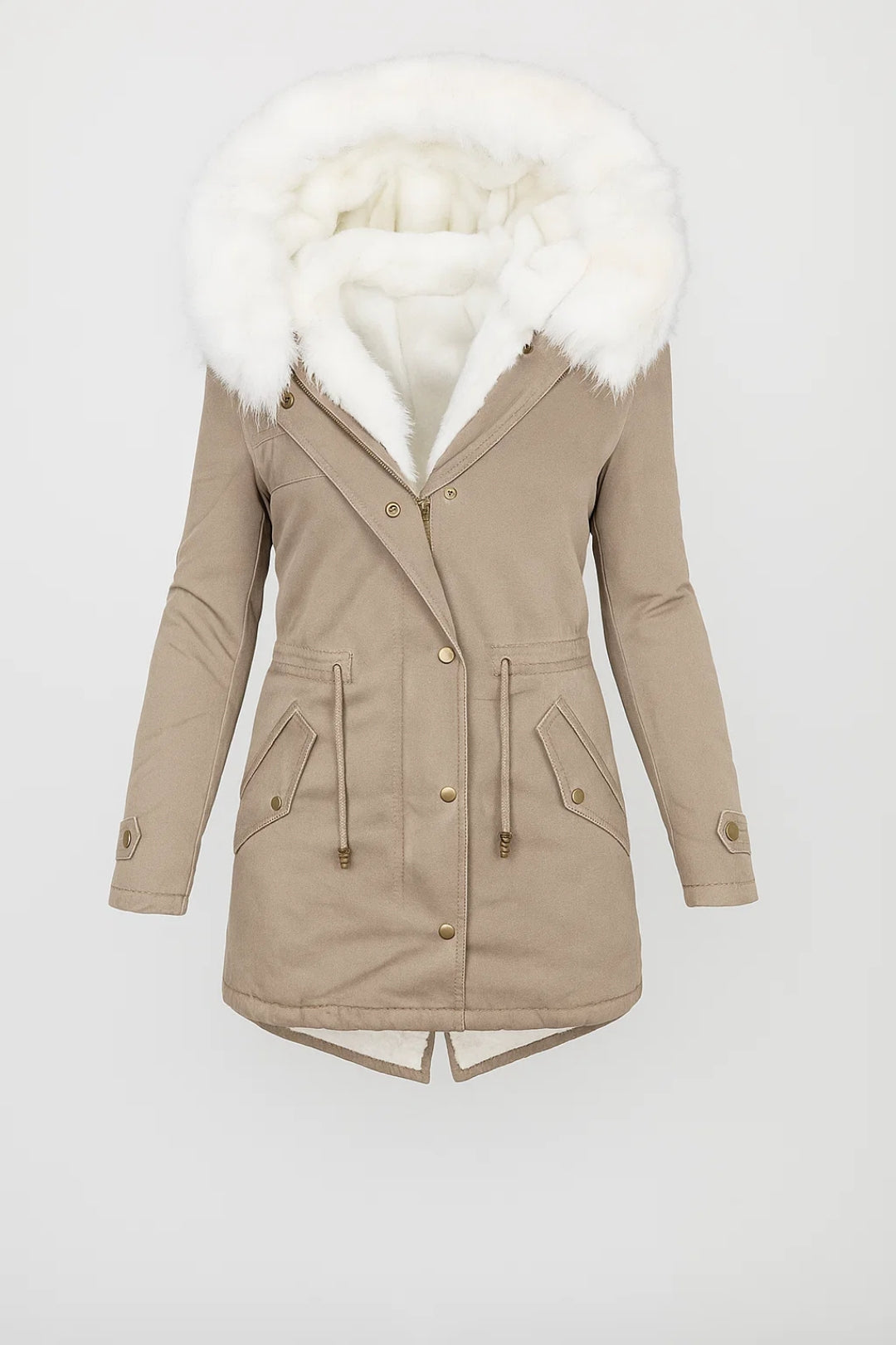 Deze parkajas is gevoerd en voorzien van een royale capuchon met zachte afwerking. De verstelbare tailleband zorgt voor een flatterende pasvorm, terwijl de steekzakken praktisch zijn voor dagelijks gebruik.