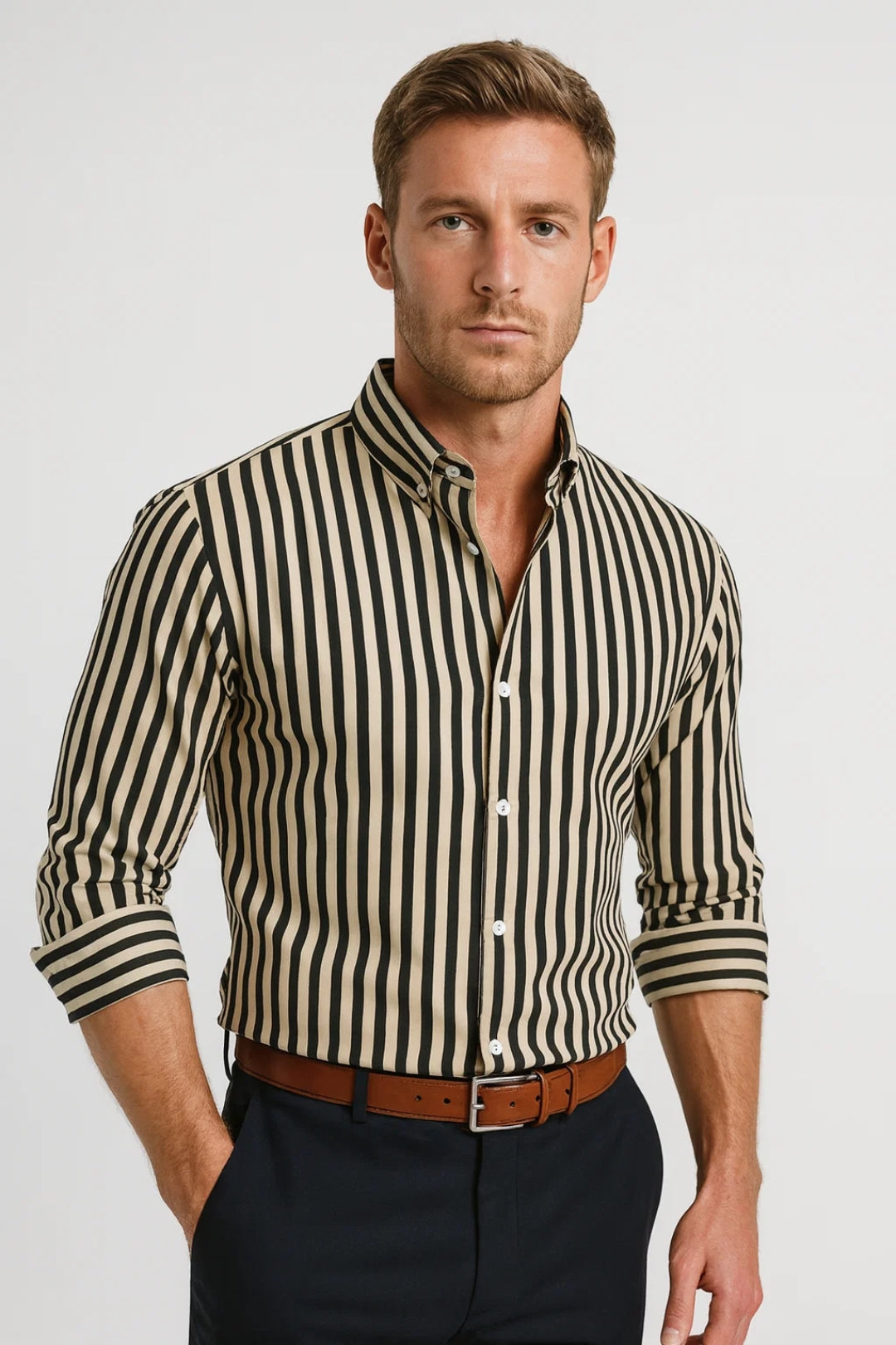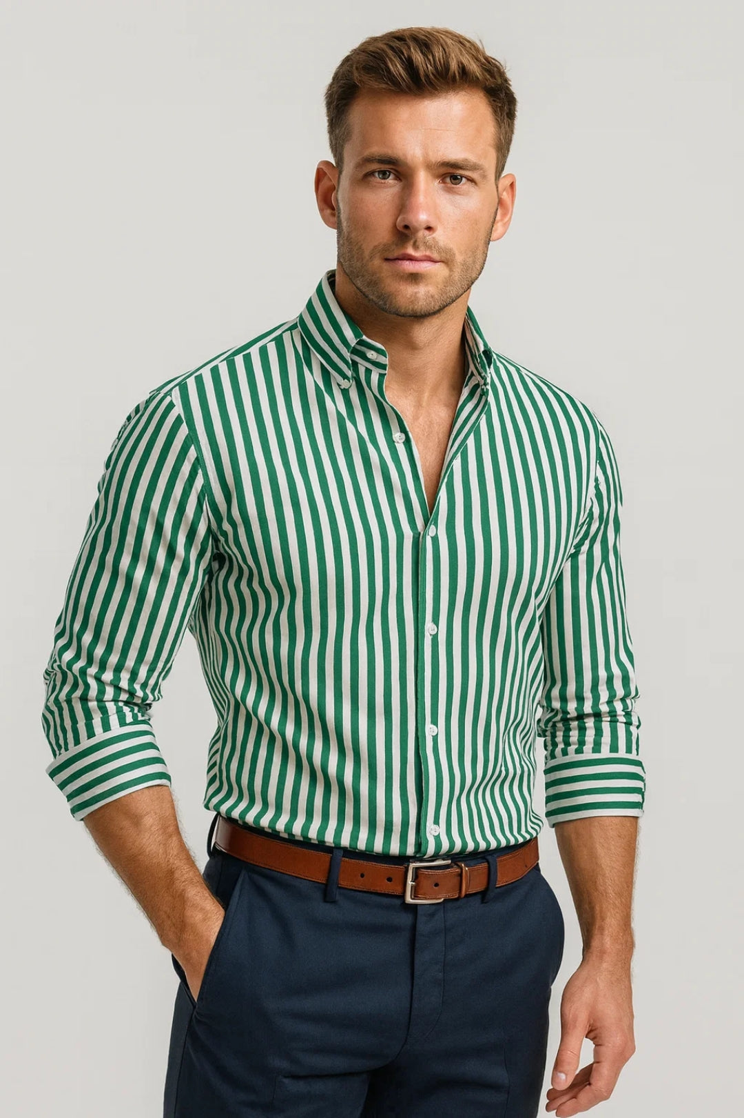 • Kenmerken: Verticale strepen, button-down kraag, lange mouw