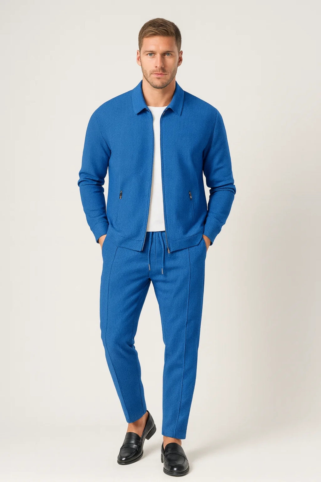 Deze tweedelige set combineert een strak jack met een comfortabele broek voor een moeiteloze, uniforme look. Het ontwerp heeft een subtiele structuur, wat zorgt voor een verfijnde maar casual uitstraling.