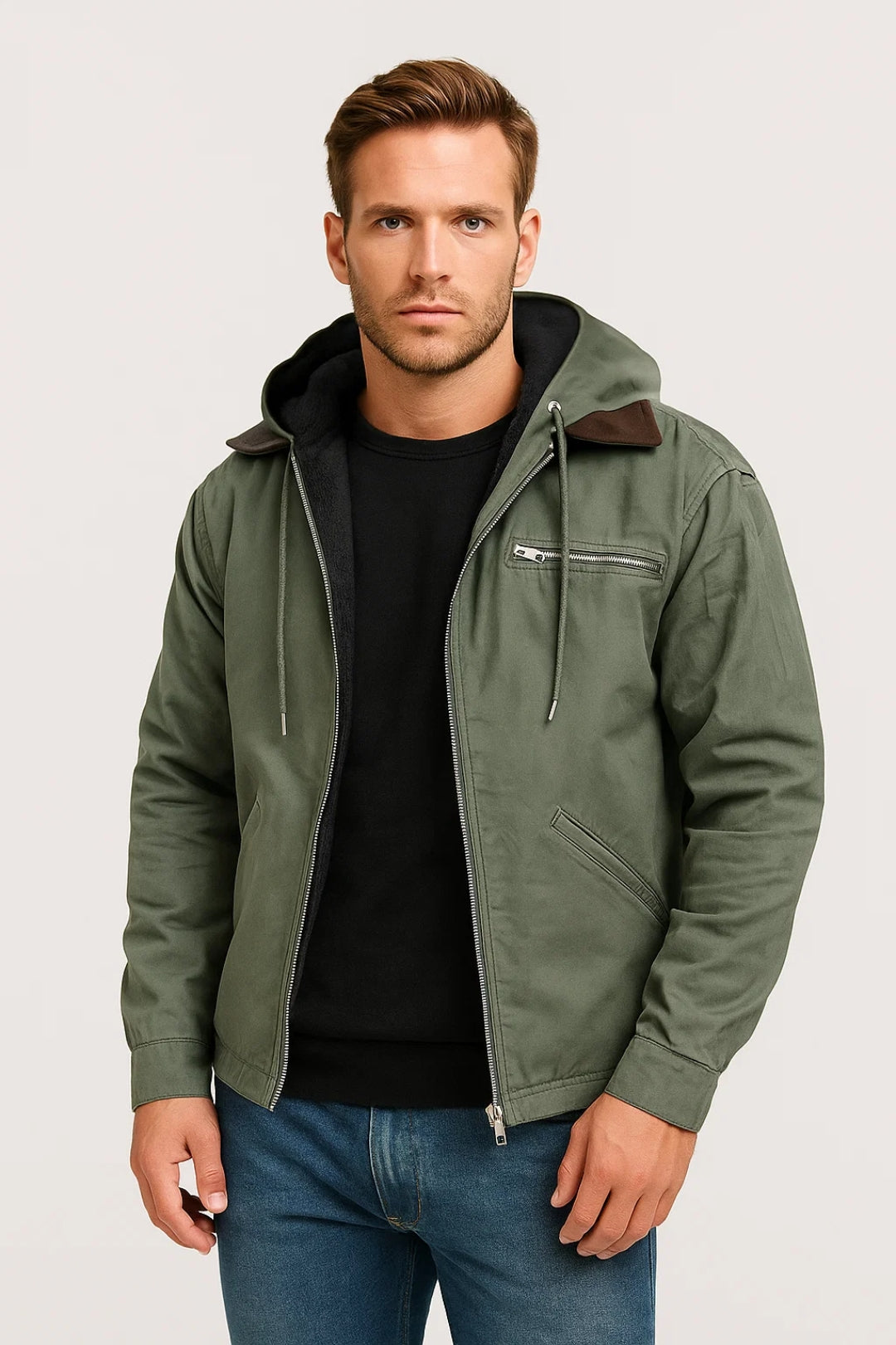 Deze herenshacket combineert de nonchalante uitstraling van een hoodie met de functionaliteit van een jas. De stevige rits, capuchon met koordsluiting en meerdere zakken maken hem onmisbaar voor dagelijks gebruik in het tussenseizoen.