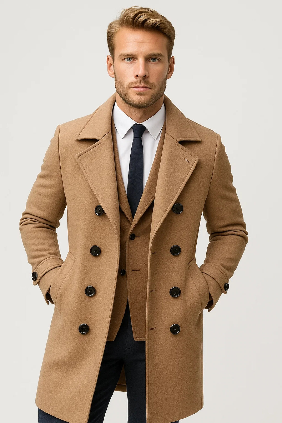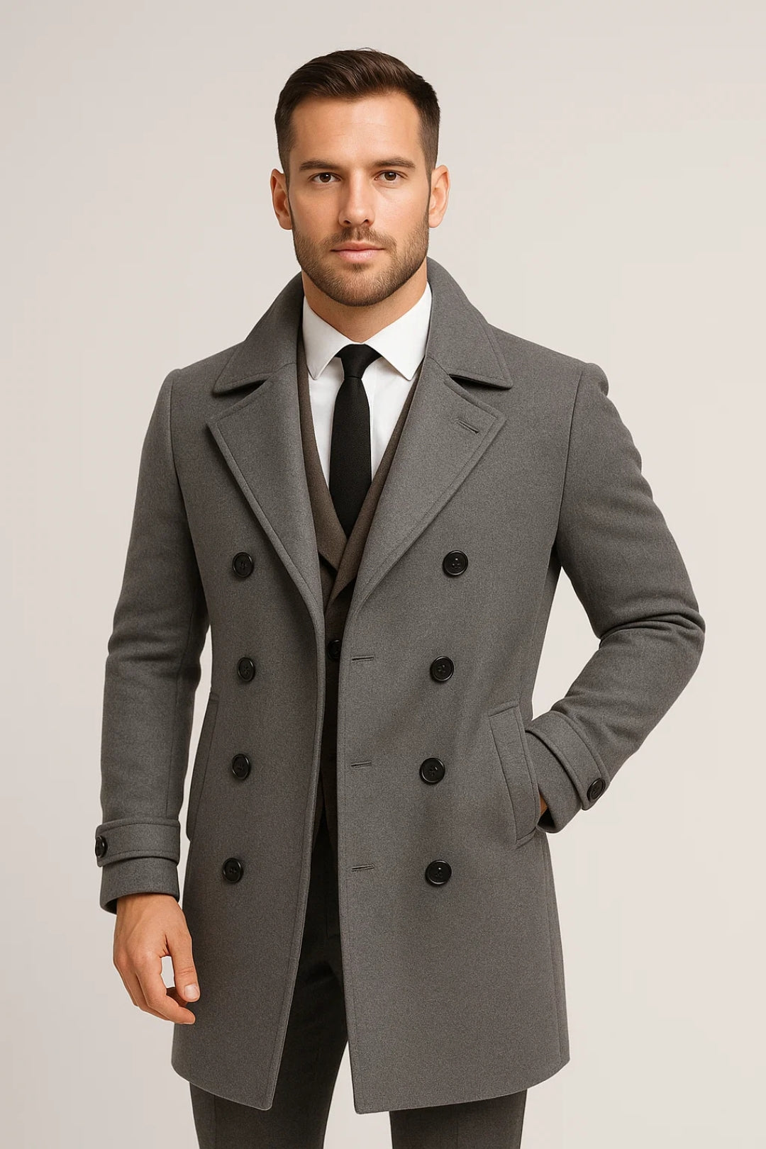 Deze lange herenjas met dubbele rij knopen en klassieke reverskraag biedt tijdloze klasse met een moderne pasvorm. De stevige constructie en verfijnde details maken het een onmisbare keuze voor koude dagen waarop stijl niet mag ontbreken.