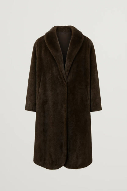Deze lange winterjas met zachte faux fur look heeft een verfijnde v-halslijn en een rechte, comfortabele pasvorm. De rijke textuur en diepe kleur zorgen voor een stijlvolle uitstraling bij elke gelegenheid.