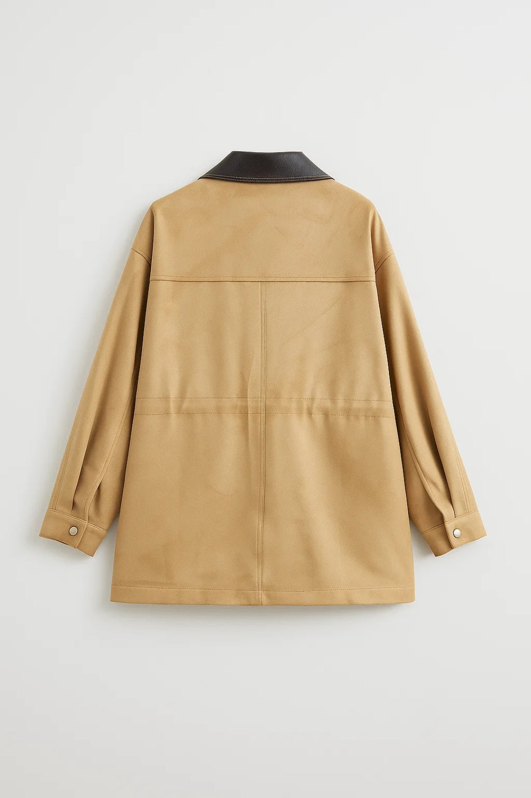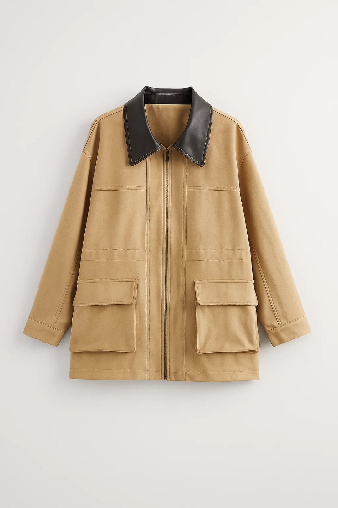 Deze jas met opvallende contrasterende kraag en praktische zakken biedt zowel comfort als een moderne uitstraling. De rechte snit zorgt voor een relaxte pasvorm die makkelijk te combineren is.