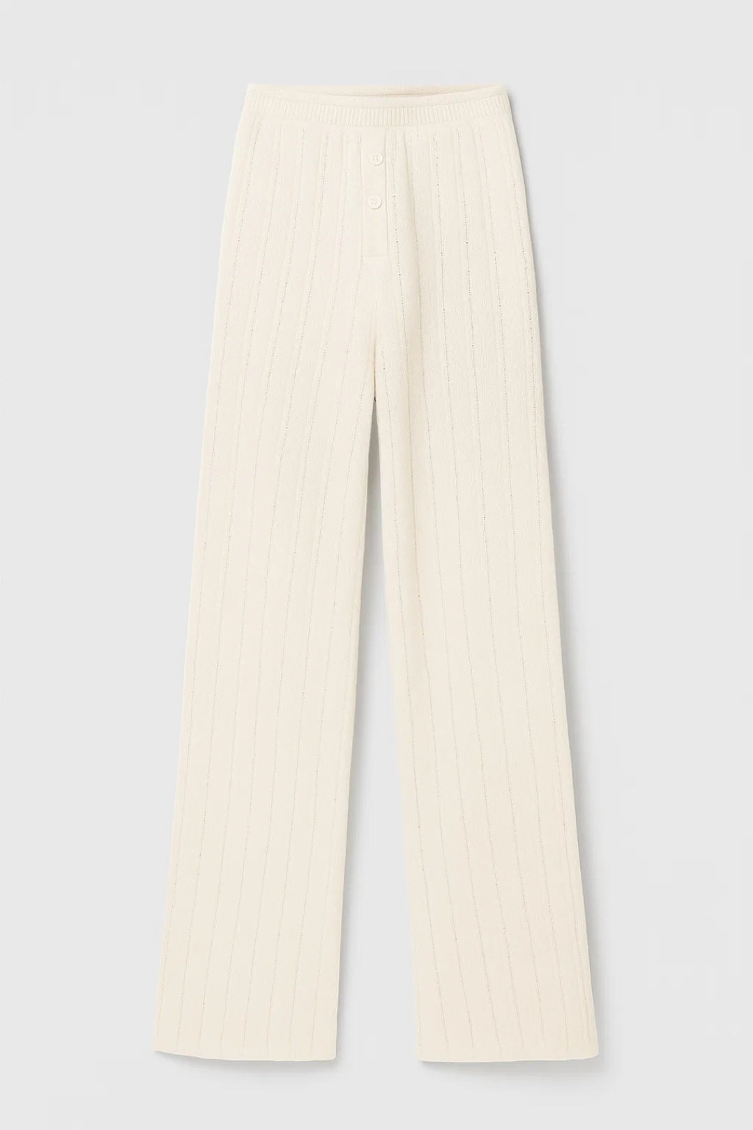 Deze tweedelige loungewear set bestaat uit een geribde top met korte mouwen en een bijpassende wijde broek met elastische taille. De zachte structuur en losse pasvorm zorgen voor ultiem comfort tijdens frisse ochtenden of relaxmomenten binnen.
