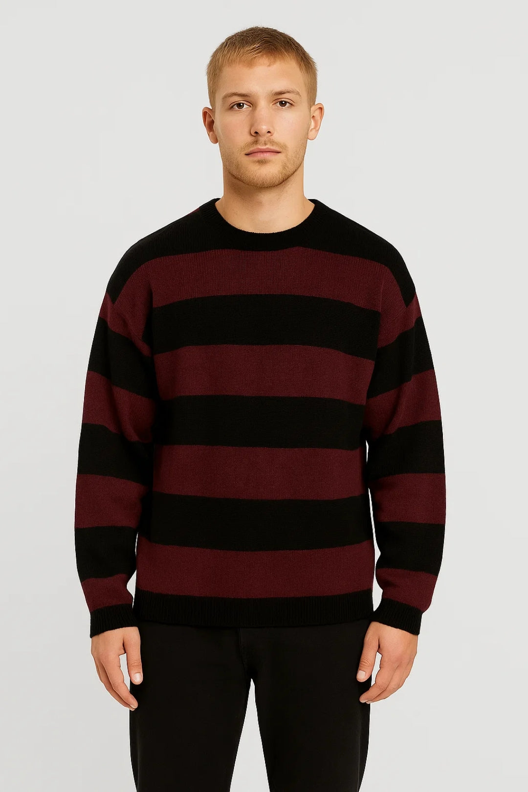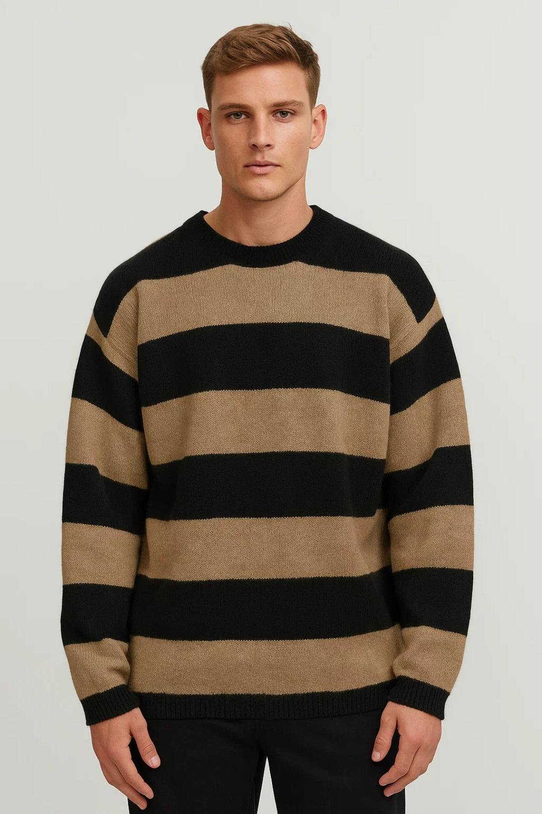 Deze herentrui met brede horizontale strepen en ronde hals is perfect voor koude dagen. De ontspannen pasvorm en zachte afwerking zorgen voor draagcomfort, terwijl het gestreepte patroon een krachtige en modieuze touch toevoegt aan elke najaarslook.
