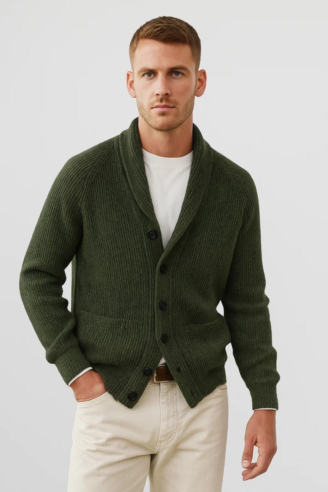 Dit gebreide herenmodel met sjaalkraag biedt een klassieke uitstraling en extra warmte rondom de nek. De grove structuur en diepe kleurtonen maken het een veelzijdige keuze voor laagjes in het najaar.