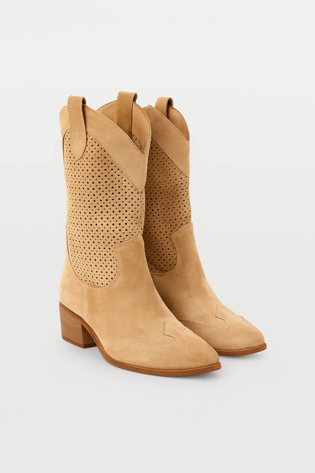 Deze western-geïnspireerde dameslaarzen combineren een tijdloos cowboymodel met verfijnde perforatiedetails. De puntige neus en stevige blokhak geven de schoen een elegante uitstraling, terwijl het ademende ontwerp perfect is voor het tussenseizoen.